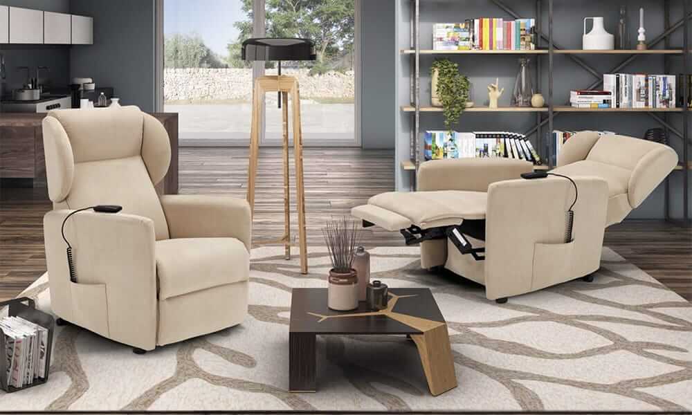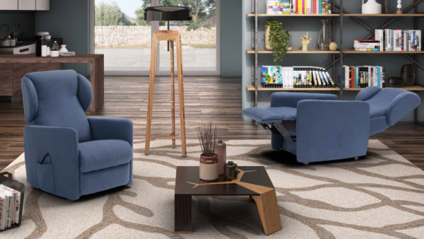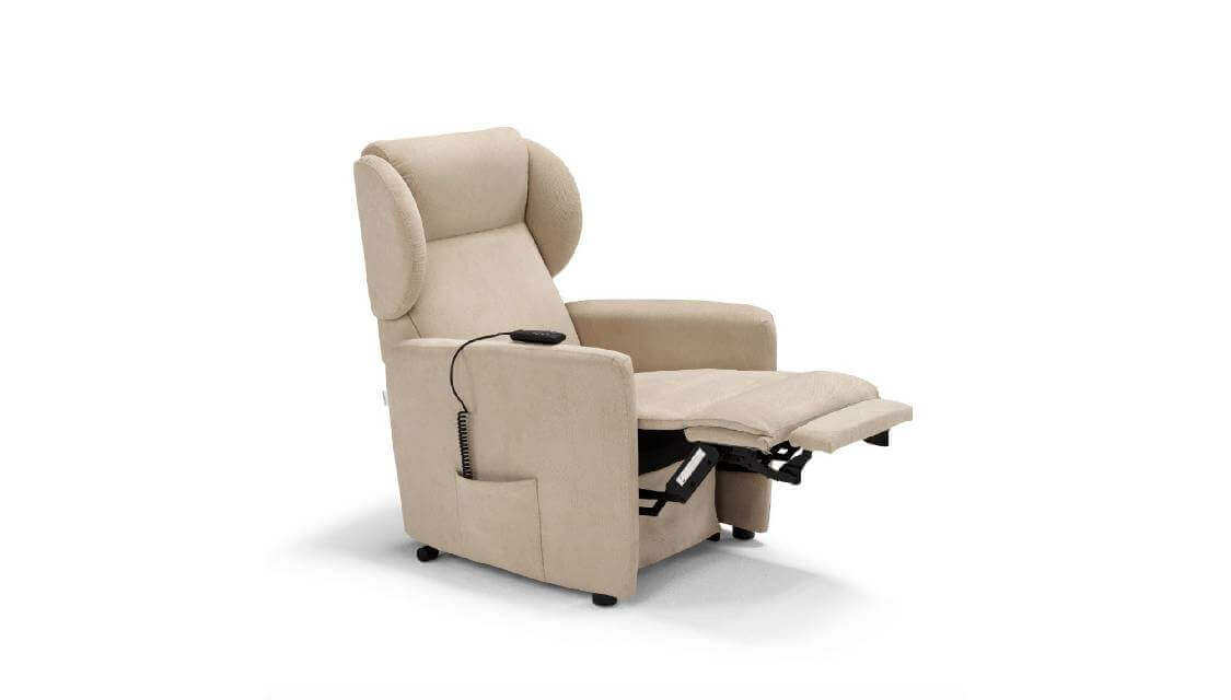 The new Carina reclining chair, equipped with the lift system, is covered with the new anti-stain Harry fabric and the mechanism comes with a 10-year guarantee.