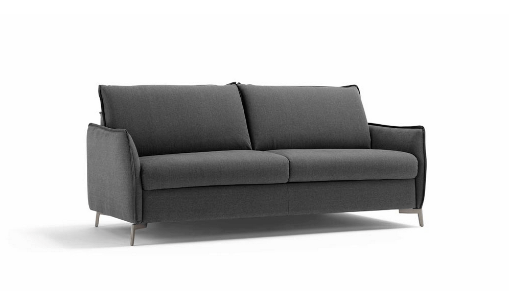 Elegante e comodissimo divano letto con piedini alti in acciao vernciati colore antracite, materasso da cm. 140×197 h 13 per uso quotidiano, braccioli di design e seduta confortevole.