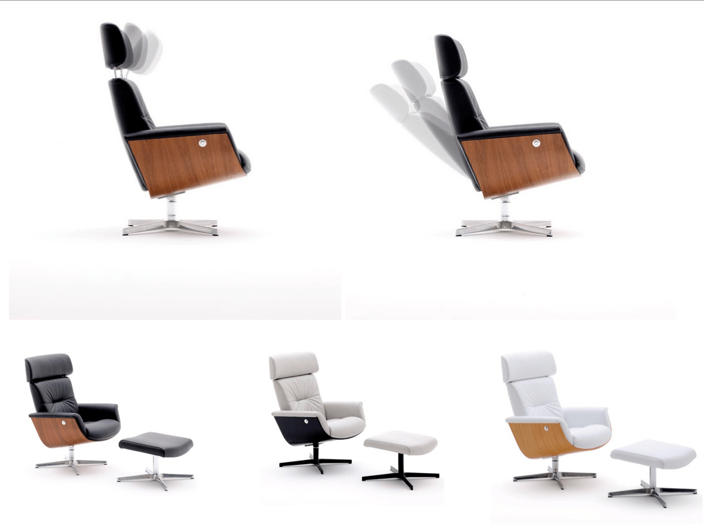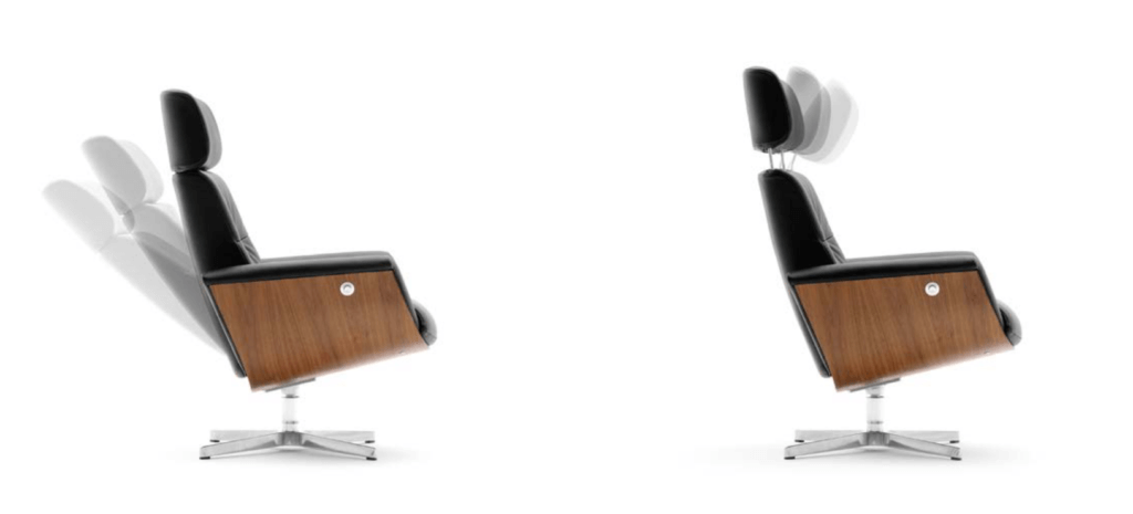 Grazie allo schienale reclinabile azionato dalla pressione sull’elegante pulsante in acciaio, al poggiatesta regolabile in altezza e ad un meccanismo girevole con return memory di conseguenza, si può passare da una posizione eretta a un’angolazione reclinata per il relax bloccando lo schienale nella posizione desiderata.