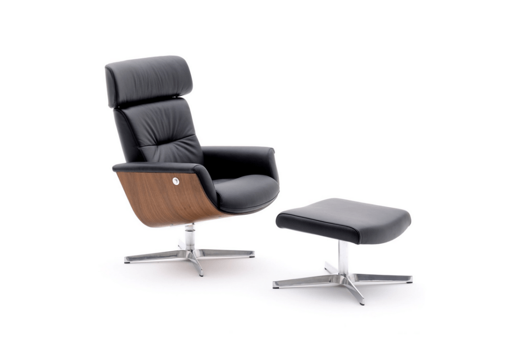 Nuova poltrona relax di design con rivestimento in pelle e scocca in multistrato impiallacciato.