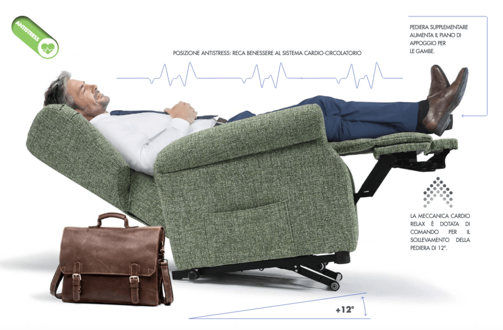 Denominata Cardio Relax, questa nuova meccanica è caratterizzata dalla funzione che permette il sollevamento di ben 12° della parte anteriore della poltrona.