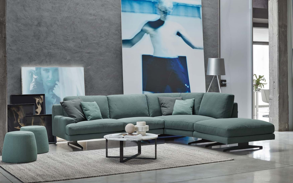 Un divano di colore ottanio, si abbina benissimo con arredi di colore neutri e chiari.