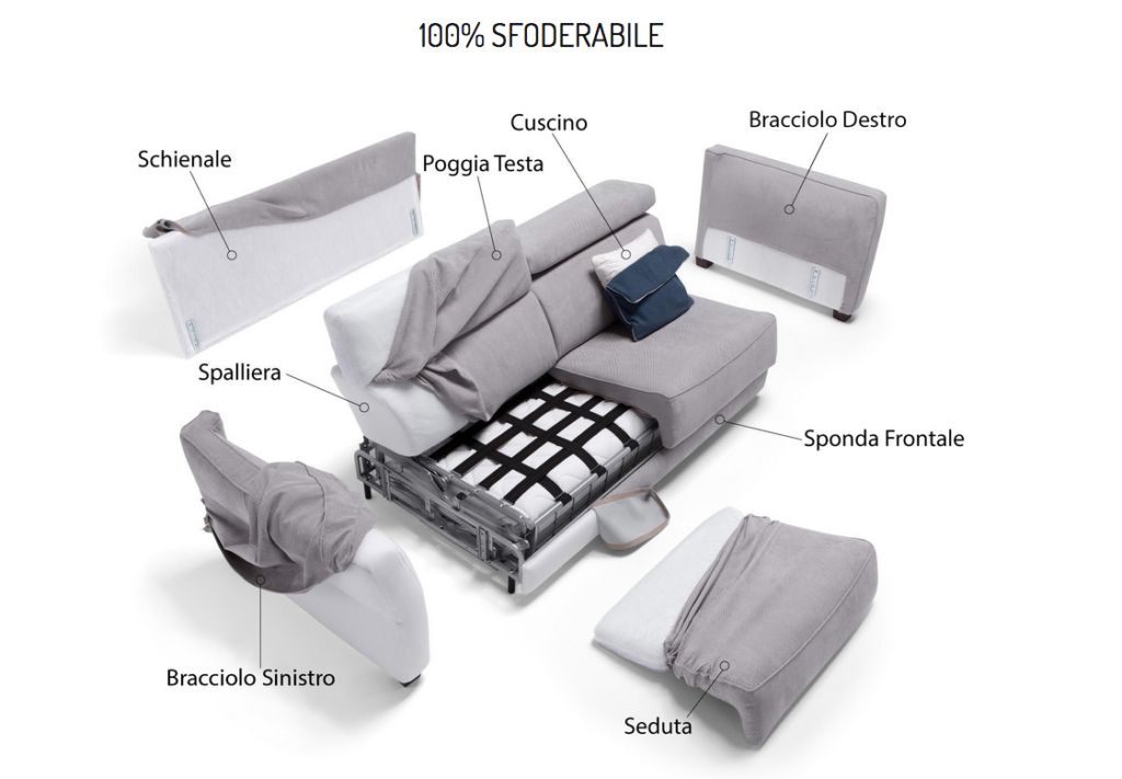 Se acquisti un divano letto in tessuto sfoderabile, potrai lavare le fodere, eseguire l’ordinaria manutenzione e avrai la possibilità, anche in un secondo momento, di scegliere un nuovo rivestimento per cambiare colore e stile al tuo divano letto.