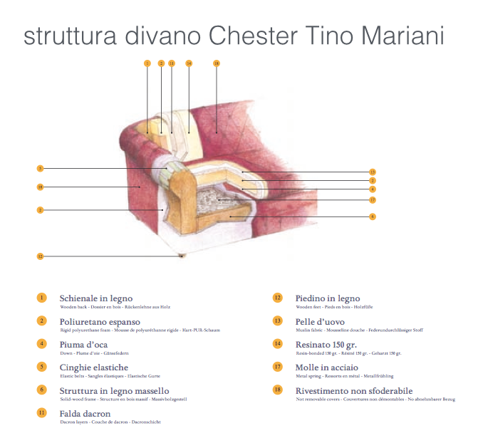 I divani e le poltrone Chester della collezione Tino Mariani sono prodotti con un solido telaio in legno massello, costruito artigianalmente come insegna la tradizione.