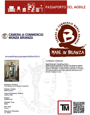 Progetto esclusivo della Camera di Commercio di Monza e Brianza che attribuisce ad ogni prodotto un certificato chiamato “Passaporto del Mobile Made in Italy” che identifica, nel nostro caso e con precisione, la provenienza e il produttore, le caratteristiche tecniche e le dimensioni di un divano, di una poltrona o di un divano letto.