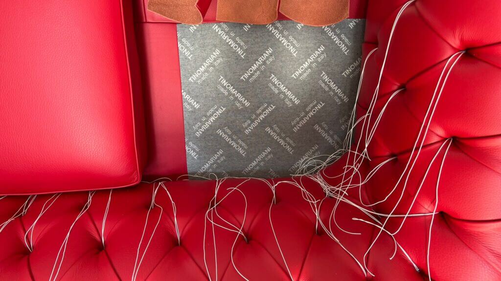 Divano Chesterfield rosso: pelle pieno fiore e molleggio con molle d’acciaio.