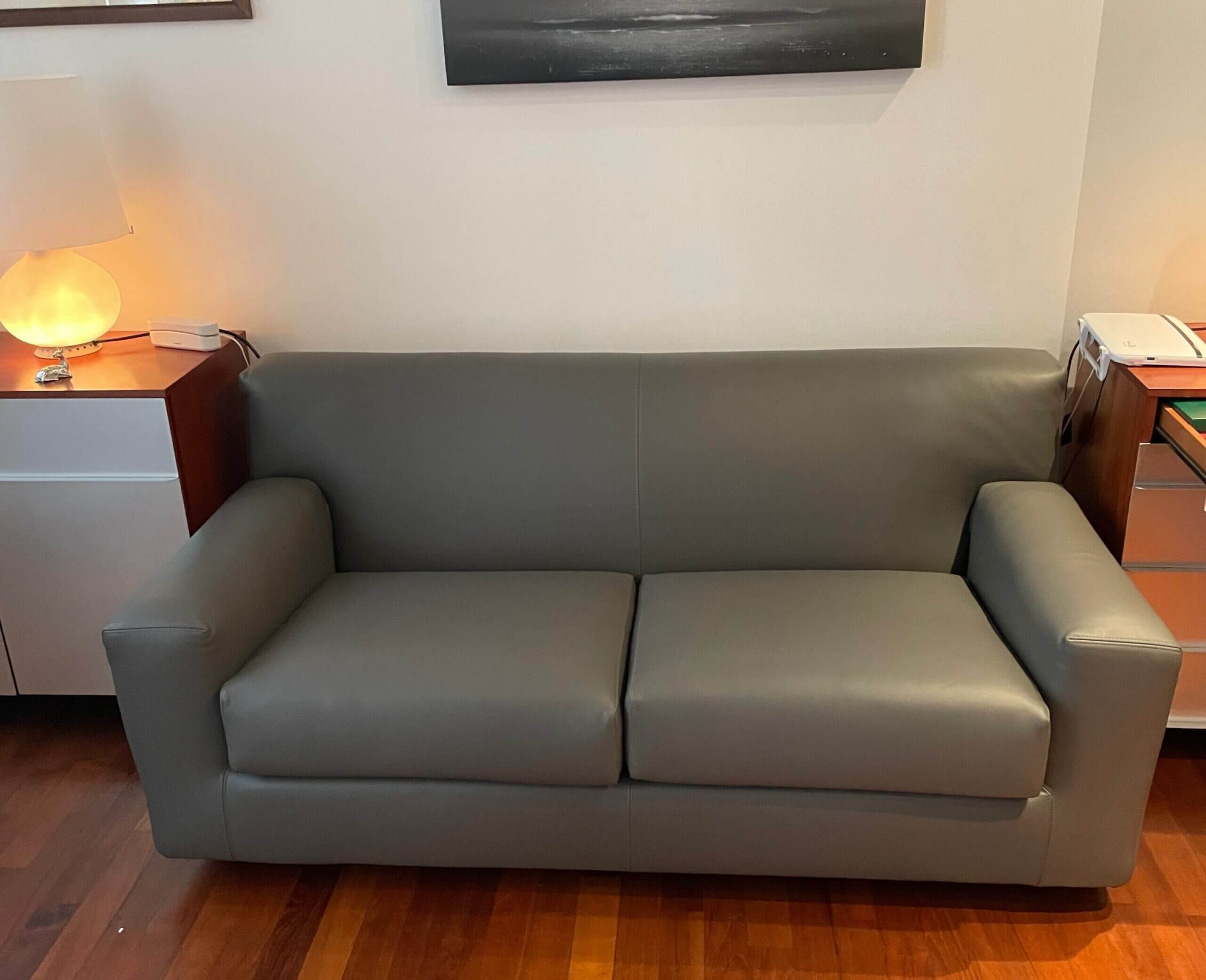 Il “ vecchio “ divano in tessuto ( modello Naviglio 1980 di Cassina ) è stato rinnovato e trasformato da divano in tessuto a divano in pelle pieno fiore.