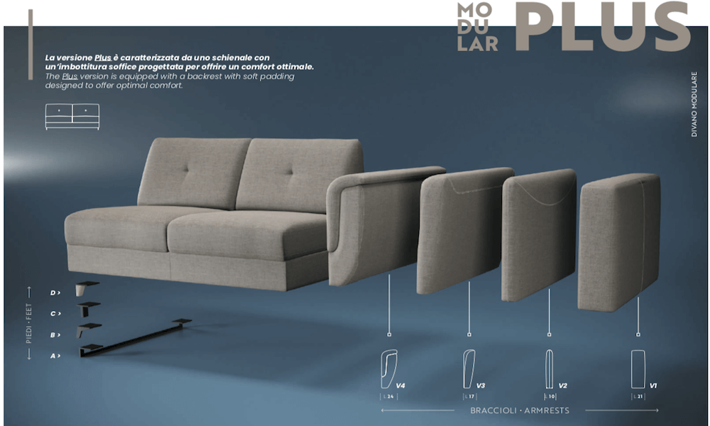 I modelli Modular Pro, Plus e Standard sono completamente personalizzabili. È possibile scegliere tra diversi braccioli, piedini e configurazioni, inclusi i divani letto angolari e quelli con chaise-longue contenitore, perfetti per unire estetica e funzionalità. - Rivestimenti per ogni stile