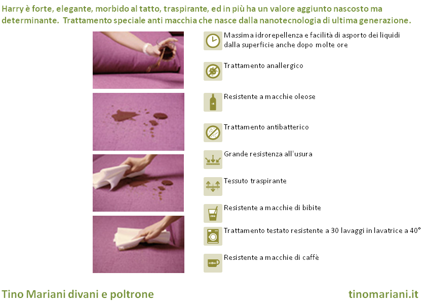 Con Harry ( 100% made in Italy ) invece il tuo divano o la tua poltrona rimarranno sempre puliti e nella massima igiene. Con l’acquisto del nuovo divano o poltrona Tino Mariani consegnerà un certificato di manutenzione dove sono indicate le procedure per il lavaggio e la smacchiatura oltre ad una tabella tecnica che indica le proprietà del tessuto Harry.