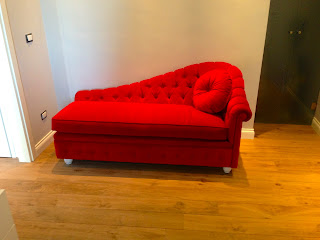 Parliamo di una chaise-longue, o meglio una mini chaise-longue Chesterina realizzata su disegno del cliente e prodotta totalmente su misura.