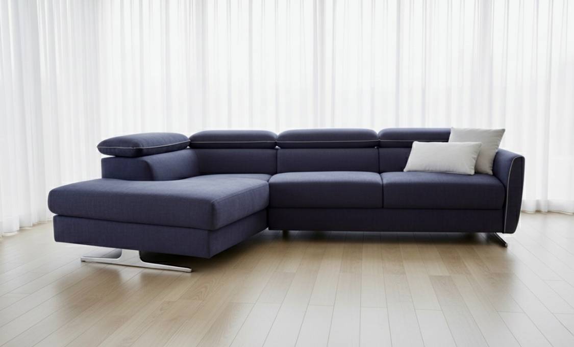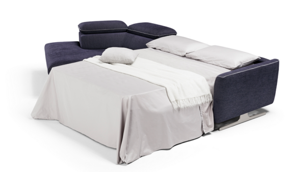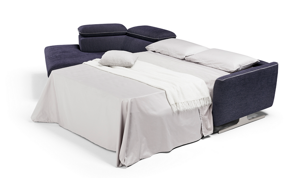 Divano letto moderno con piedi alti in metallo.