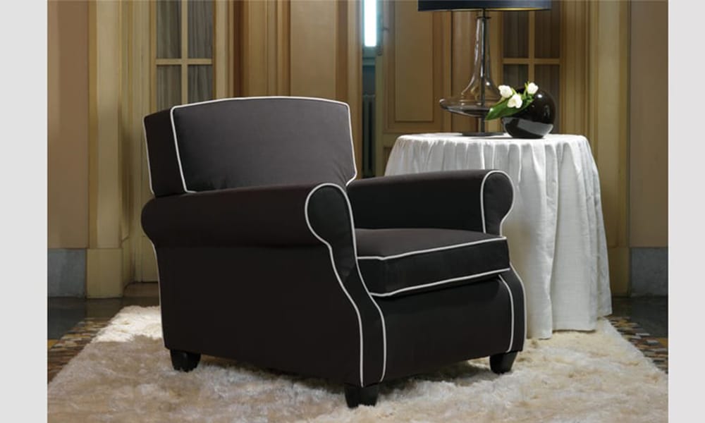 Poltroncina classica disponibile con rivestimento in tessuto completamente sfoderabile, dalle forme morbide e delicate, la poltrona Violetta è impreziosita dal tessuto dei contorni in tinta o in contrasto con il colore della poltrona.