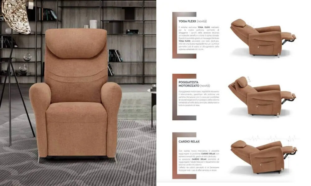 Se soffri di mal di schiena e cerchi il massimo comfort, la poltrona relax Yoga Flexx Emilia è la scelta perfetta per te. Questa innovativa poltrona relax elettrica, disponibile da Tino Mariani a Lissone, unisce tecnologia all’avanguardiae design ergonomico per offrirti un supporto ottimale durante il riposo e il relax quotidiano.