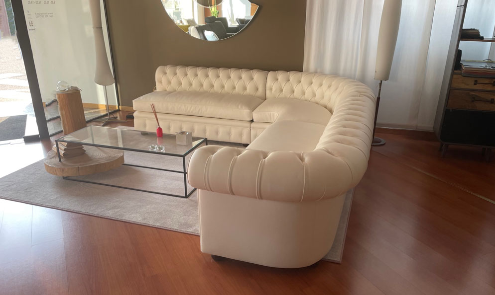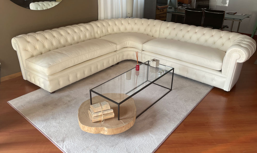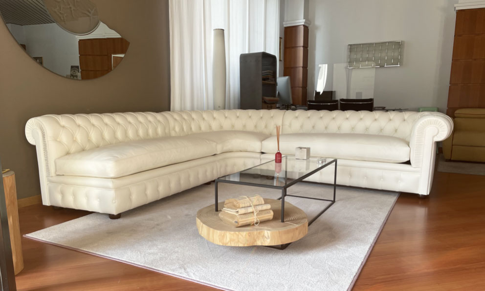 Realizzazione divano Chester angolare Su Misura in pelle fiore colore latte